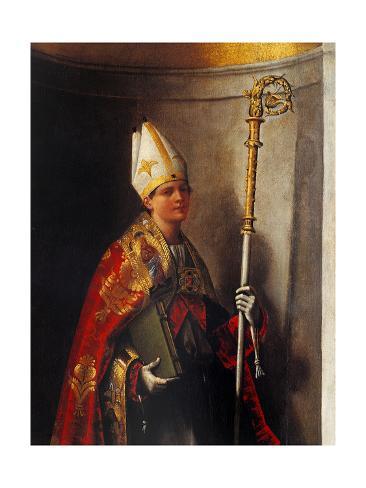| ATTRIBUTES | boy bishop, often with a discarded crown by his feet; represented vested in pontifical garments and holding a book and a crosier |