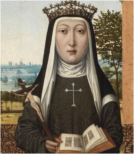 Catherine came from an aristocratic Bolognese family, the daughter of Benvenuta Mammolini of Bologna and Giovanni Vigri, an ambassador to Niccolò III d’Este, Marquis of Ferrara.[1] From the age of nine, she was raised at the court of the Duke of Ferrara as a lady-in-waiting of his daughter Margherita d’Este. During this time, she received an excellent training in reading, writing, music, singing, drawing and illuminating.[2]